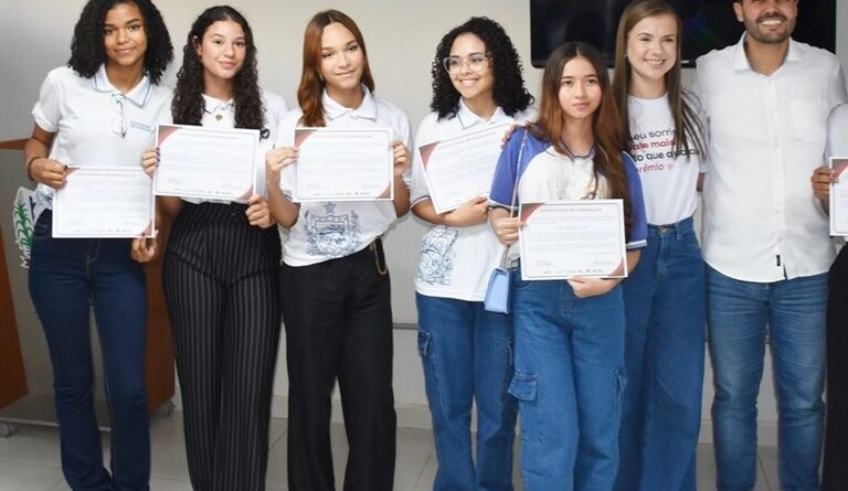 Os 10 estudantes da rede estadual de ensino, vencedores da 2ª edição do Concurso “Desafio Nota 1000 de Educação Fiscal”, receberam