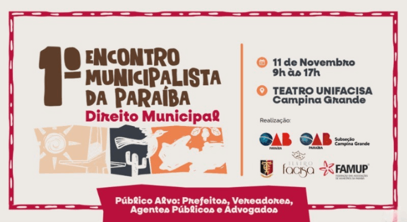A Federação das Associações de Municípios da Paraíba (Famup) e a Ordem dos Advogados do Brasil – Seccional Paraíba (OAB-PB) realizam, no próximo dia 11 de novembro, em Campina Grande, o 1º Encontro Municipalista da Paraíba de Direito Municipal. O evento acontece no Teatro Facisa e conta ainda com o apoio do Tribunal de Contas do Estado da Paraíba (TCE-PB) e da subseção da OAB-Campina Grande. As inscrições podem ser feitas pelo link https://doity.com.br/encontromunicipalistadaparaiba/ .