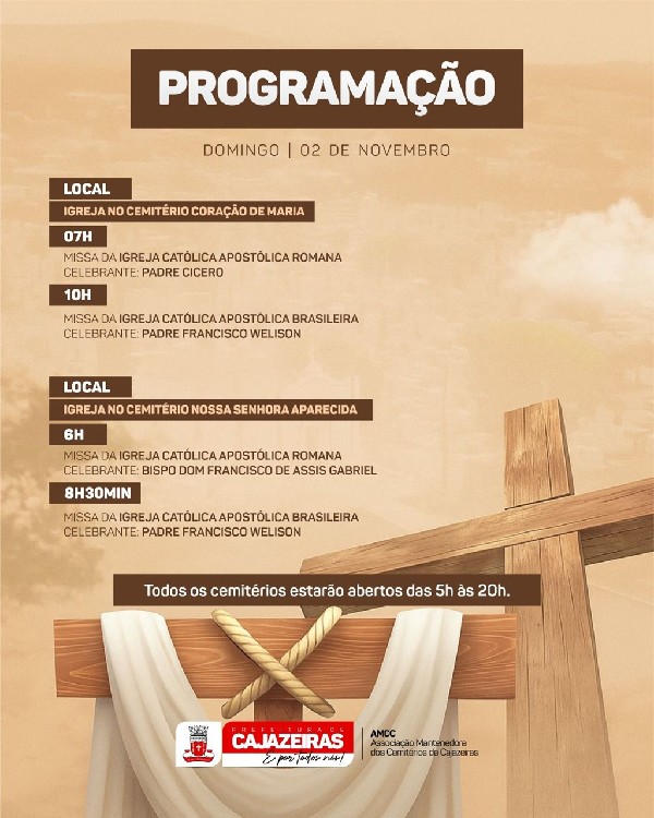 Neste sábado (1), a Prefeitura de Cajazeiras divulgou os horários das missas que serão celebradas neste domingo (2), Dia de Finados, nos campos santos da cidade.