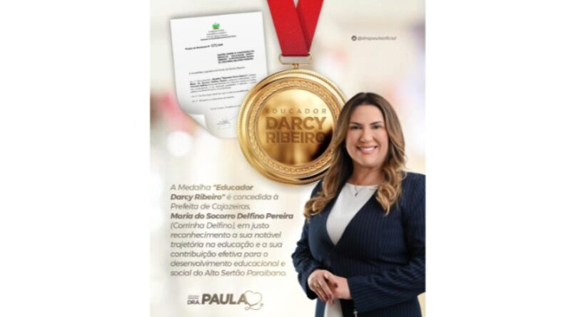 A Assembleia Legislativa da Paraíba (ALPB) concedeu, por iniciativa da deputada estadual Doutora Paula (Progressistas), a Medalha Educador Darcy Ribeiro à prefeita de Cajazeiras, Maria do Socorro Delfino Pereira, conhecida como Corrinha Delfino. A honraria reconhece personalidades que contribuem de forma significativa para a promoção da educação e para o desenvolvimento social do estado.