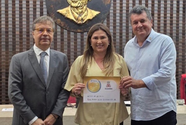A prefeita de Cajazeiras, Corrinha Delfino, recebeu das mãos presidente do TCE, o conselheiro Fábio Nogueira, o Selo Ouro do