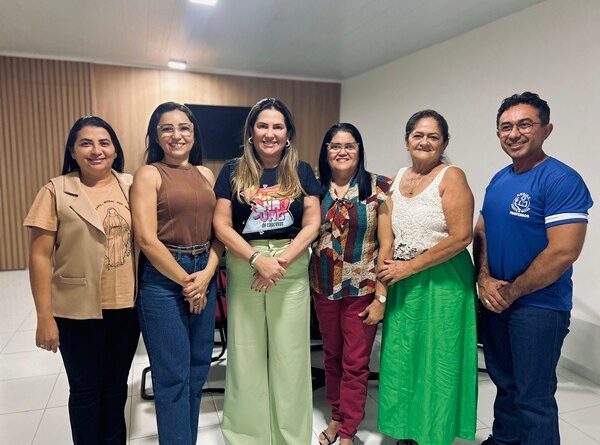 A prefeita de Cajazeiras, Corrinha Delfino, ao lado da secretária municipal de Educação, Joseane Maciel, da presidente do SINFUNC, Elinete